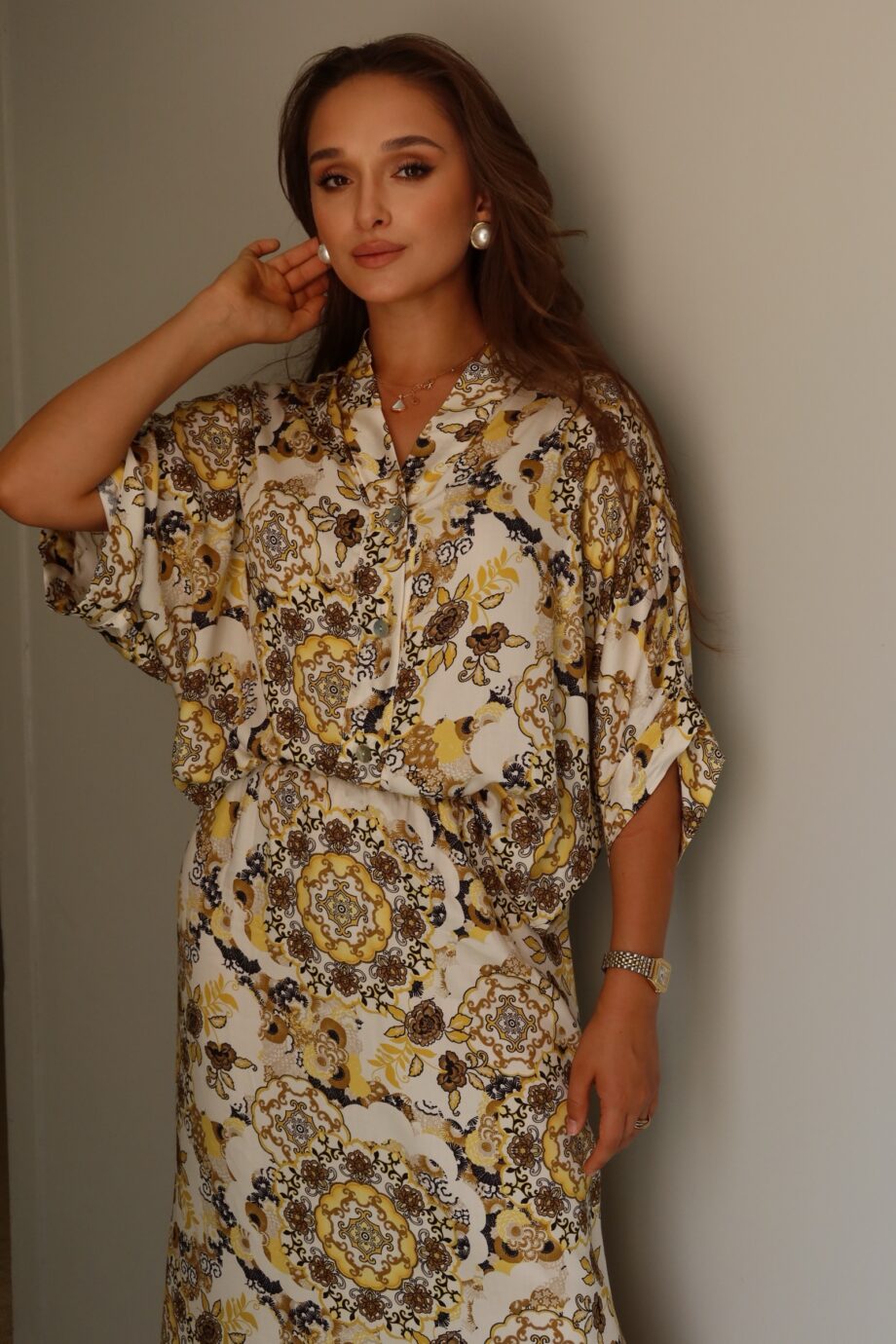An elegant ensemble featuring a ¾-sleeve blouse and a maxi skirt. The refined cut highlights femininity and grace, while the interior is finished with luxury closed seams, reflecting meticulous attention to detail.