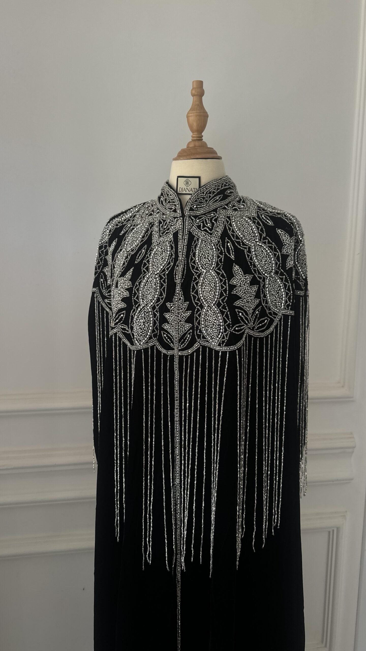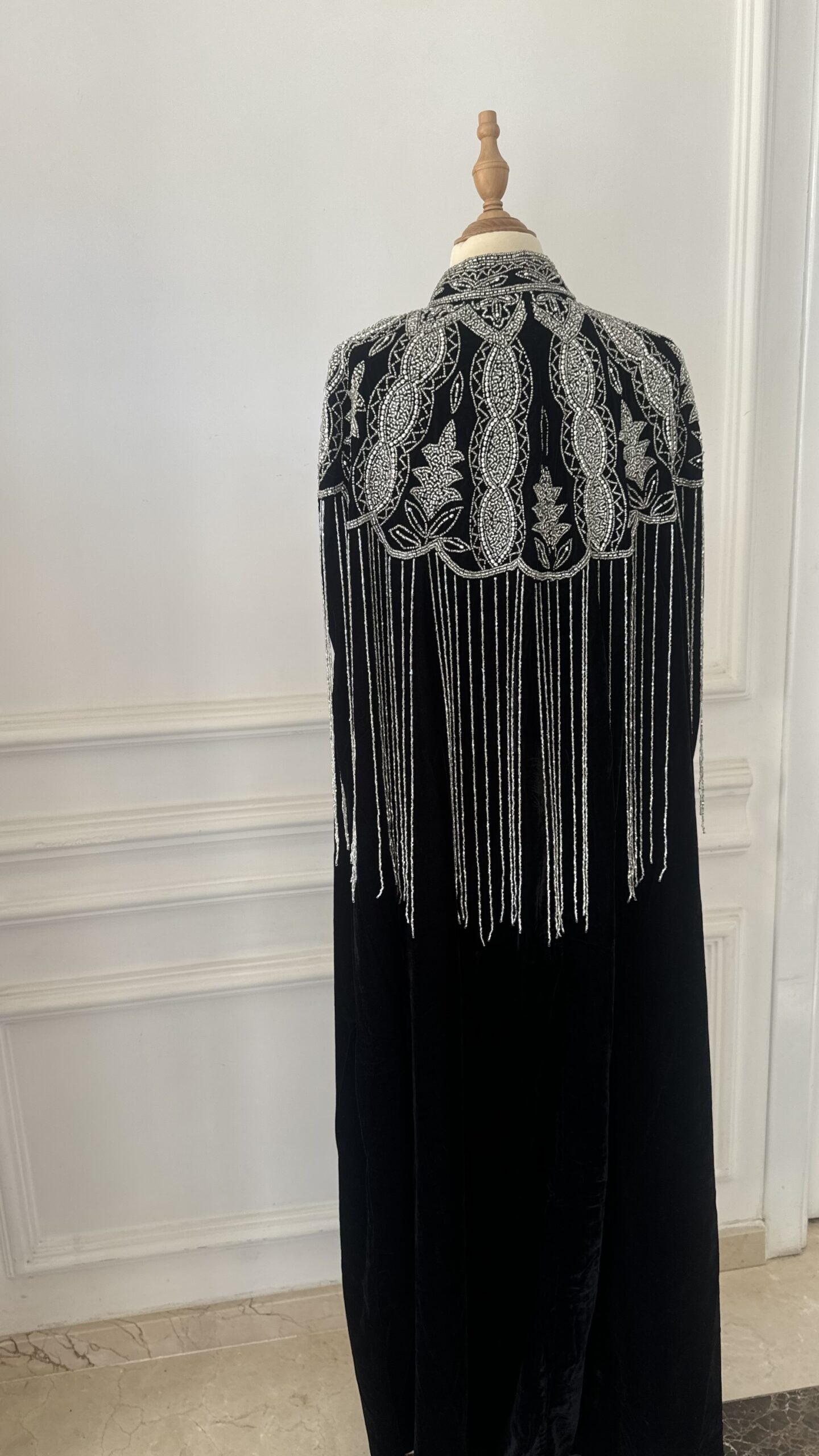 The NOURA Abaya is crafted from luxurious velvet and fully adorned with exquisite hand embroidery.